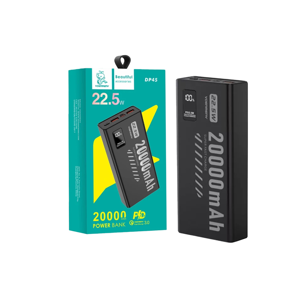 پاوربانک VDENMENV 20000 مدل DP45 با ظرفیت بالا و طراحی شیک، گزینهای مناسب برای شارژ انواع گوشی هوشمند، تبلت و سایر دستگاههای دیجیتال است.