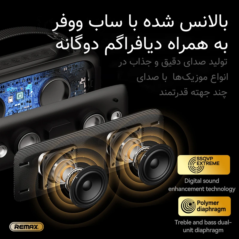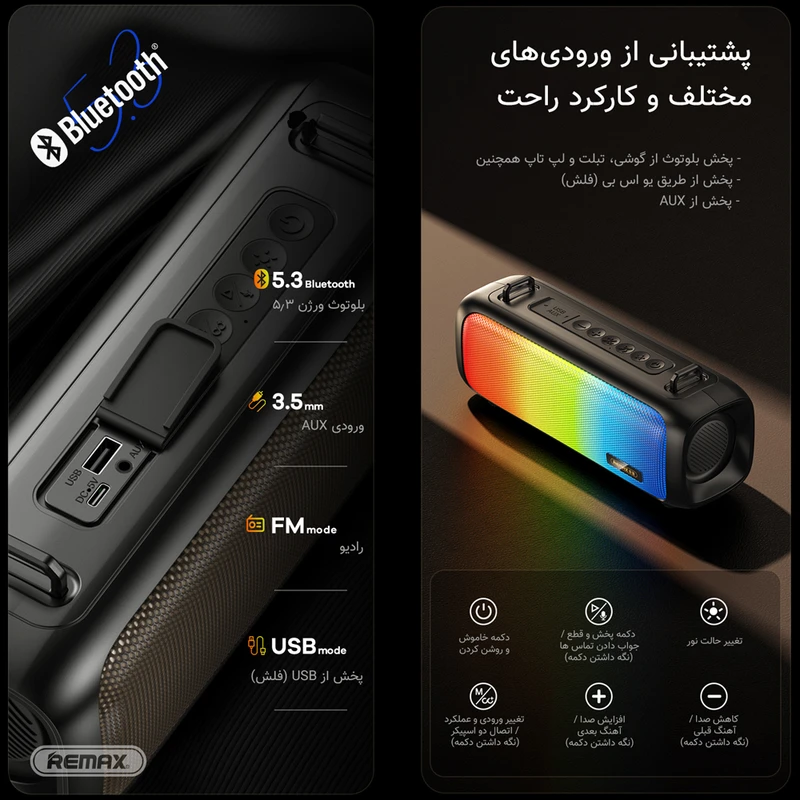 اسپیکر بلوتوثی M67 NEW محصول جدید از شرکت خوشنام و قدیمی ریمکس است که هم روح شما رو نوازش میکند. اسپیکر بلوتوث ریمکس فقط یک اسپیکر نیست، یک مهمانی گردان است. دارای چراغ های LED رنگی است که با ریتم موسیقی تغییر میکند و جلوه بصری خیره کنندهای ایجاد میکند. شما میتوانید از بین حالتهای مختلف نور، متناسب با حال و هوای خود انتخاب کنید. اسپیکر بلوتوث M67 NEW همچنین به لطف طراحی صدای 360 درجه و درایورهای دوگانه، صدایی قدرتمند و فراگیر را ارائه میدهد به طوری که بدون توجه به جایی که بلندگو را قرار میدهید، میتوانید از آهنگ های مورد علاقه خود با وضوح شفاف و بیس غنی لذت ببرید. اسپیکر بلوتوث ریمکس ، به کمک دکمههای کنترلی ساده و پشتیبانی از حالتهای بلوتوث ، AUX و پخش از فلش، به راحتی قابل استفاده و اتصال به همه دستگاهها است و میتوانید از هر دستگاهی موسیقی پخش کنید. و با باتری 1500 میلیآمپر ساعتی میتوانید تا 7 ساعت از پخش مداوم لذت ببرید. اسپیکر بلوتوث ریمکس همراه مناسبی برای استفاده در منزل، محل کار یا خارج از منزل برای مهمانی یا فضاهای باز است. این اسپیکر دارای طراحی شیک، ظریف، بادوام و قابل حمل است و دارای دسته ای برای حمل آسان.