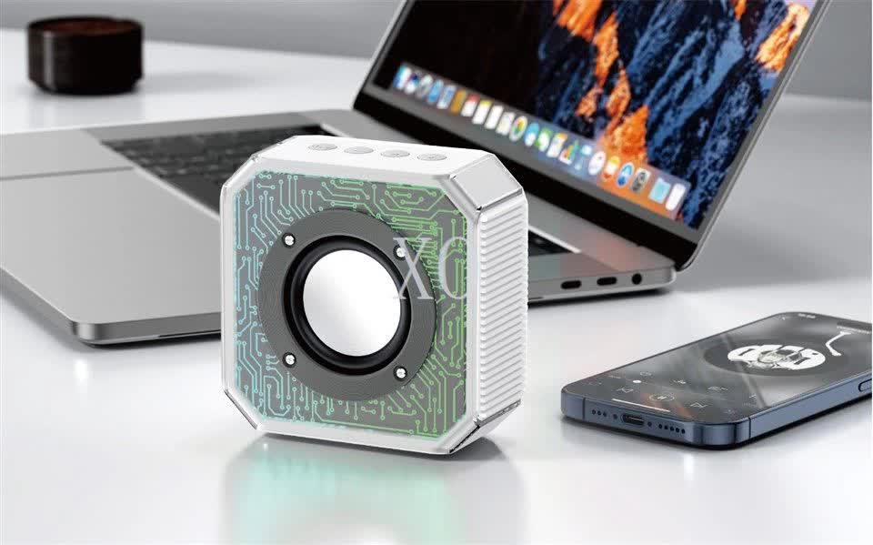 اسپیکر بلوتوثی همراه با نورپردازی و کیفیت صدای عالی، طراحی منحصر به فرد و جذاب: بدنهای شفاف با طرح مدار الکترونیکی و نورپردازی RGB که ظاهری زیبا به آن بخشیده شده است. این طراحی آن را از اسپیکرهای معمولی متمایز میکند.
